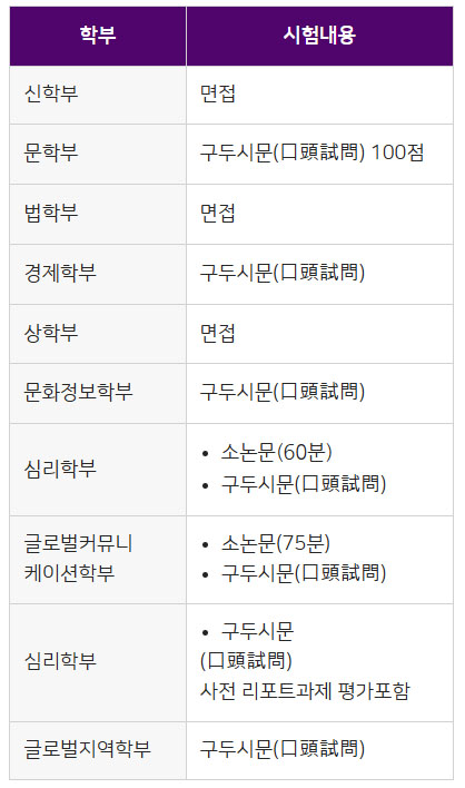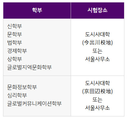 도시샤대학 외국인입시는 학부에 따라 서류심사만으로 선발하거나 서류심사와 대학시험을 통해 선발합니다. 학부별 선발방법은 아래를 참고해주세요.