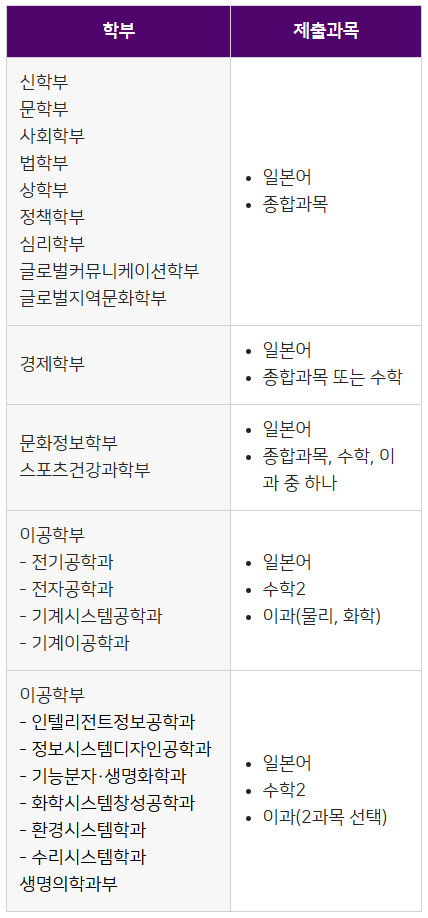 학부, 학과에 따라 제출하는 일본유학시험 과목입니다.