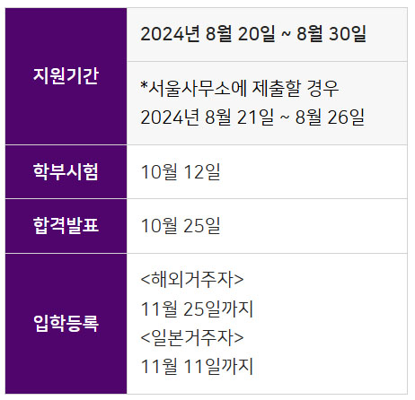 -일본에 있는 외국인학교 또는 일반 초, 중, 고를 다녔을 경우, 총 재학기간이 4년 이내여야 하며 일본에서 고등학교를 졸업한 경우 지원할 수 없습니다.